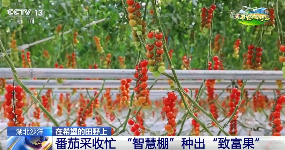 面前这座银灰色的智能温室大棚就是荆门市沙洋县沈集镇的番茄种植。大棚里,高约5米的番茄藤蔓划一陈列,成串的小番茄缀满枝头,分拣、打包,将新颖番茄运往市场。